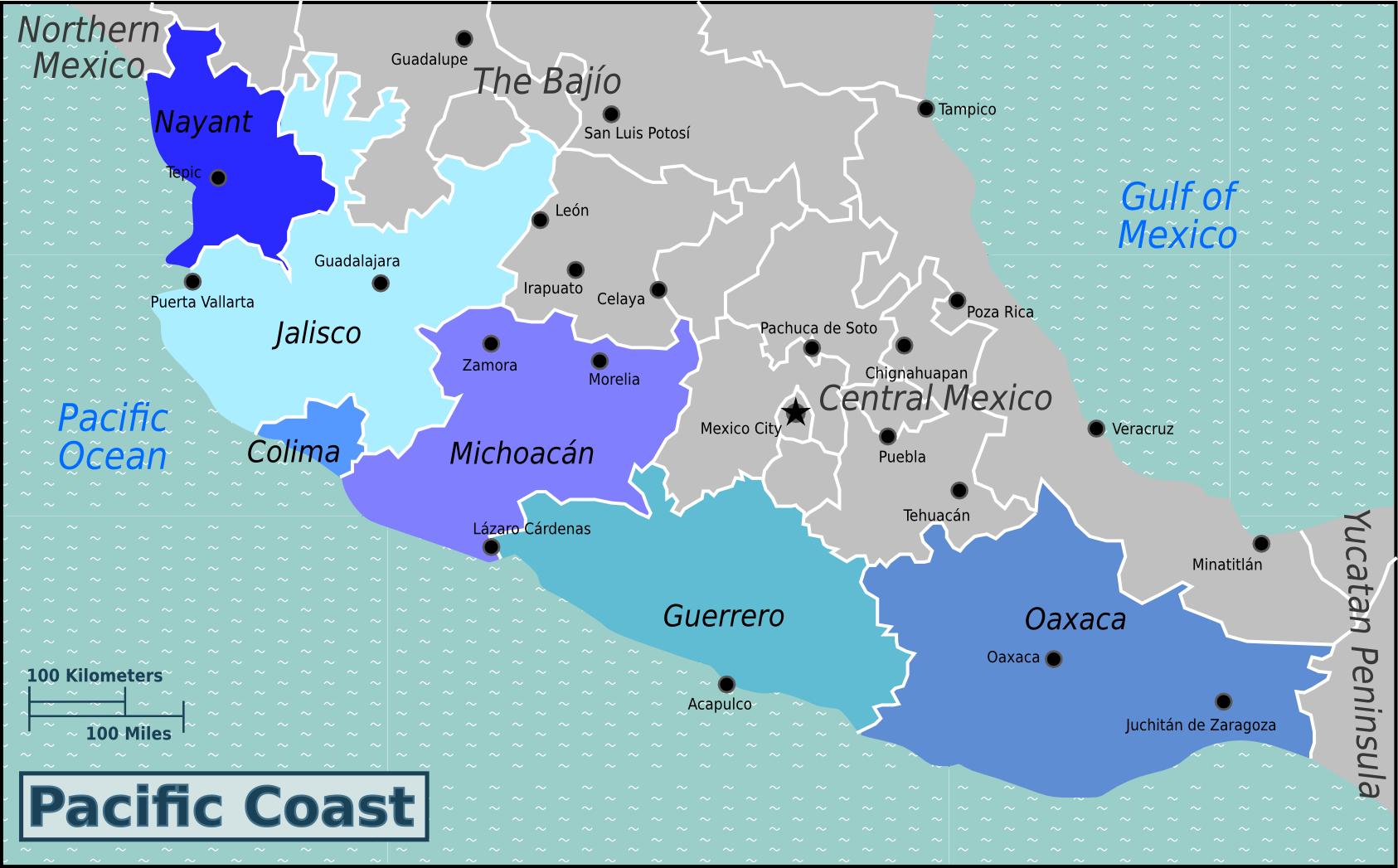 მექსიკაში, წყნარი ოკეანის სანაპიროზე რუკა